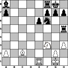 game notation in PGN-format [Event "Schachkreis #1"] [Site "www.myChess.de"] [Date "2018.06.08"] [Round "1"] [White "Joschi"] [Black "miu"] [ECO "C13"] [WhitemyELO "1555"] [BlackmyELO "1552"] [Result "0-1"] [TimeControl "10/2592000"] [WhiteDays "30"] [BlackDays "30"] [MyChessNo "112408"] 1. e4 e6 2. d4 d5 3. Nc3 Nf6 4. Bg5 Be7 5. exd5 Nxd5 6. Bxe7 Nxe7 7. Nf3 b6 8. Bb5+ c6 9. Ba4 Ba6 10. Ne2 O-O 11. O-O Qc7 12. c3 Nd7 13. Re1 Rad8 14. Qc2 Nf6 15. Ng3 Bb7 16. Ne5 b5 17. Bb3 c5 18. dxc5 Qxc5 19. Rad1 Ned5 20. Ne4 Nxe4 21. Qxe4 Ba8 22. Qh4 Nf6 23. Bc2 Rd5 24. Nf3 Rh5 25. Qg3 b4 26. Re3 Nd5 27. Red3 bxc3 28. bxc3 Nxc3 29. Re1 Ne4 30. Qg4 Qxf2+ 31. Kh1 Nf6 32. Rd2 Nxg4 33. Rxf2 Nxf2+ 34. Kg1 Ng4 35. h3 Nf6 0-1 position notation in FEN-format b4rk1/p4ppp/4pn2/7r/8/5N1P/P1B3P1/4R1K1 - - - 1 36 Captured white pieces: Captured black pieces: Click on a captured piece in order to display the desired move!