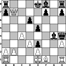 game notation in PGN-format [Event "Neues Jahr 2010"] [Site "www.myChess.de"] [Date "2010.01.01"] [Round "1"] [White "babikar"] [Black "Haneken"] [ECO "B20"] [WhitemyELO "1286"] [BlackmyELO "1404"] [Result "0-1"] [TimeControl "10/3456000"] [WhiteDays "65"] [BlackDays "78"] [MyChessNo "61997"] 1. e4 c5 2. c4 Nc6 3. Nc3 Nf6 4. d3 d6 5. h3 e5 6. f4 Be6 7. f5 Bd7 8. Nf3 g6 9. Be3 gxf5 10. exf5 Bxf5 11. Qb3 Nd4 12. Nxd4 cxd4 13. Nd5 dxe3 14. Nxf6+ Qxf6 15. g4 Bxg4 16. Qxb7 Qh4# 0-1 position notation in FEN-format r3kb1r/pQ3p1p/3p4/4p3/2P3bq/3Pp2P/PP2P3/R3KB1R - KQkq - 1 17 Captured white pieces: Captured black pieces: Click on a captured piece in order to display the desired move!