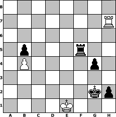 game notation in PGN-format [Event "NoEngine02"] [Site "www.myChess.de"] [Date "2007.11.17"] [Round "1"] [White "Andreas"] [Black "Tommy6"] [ECO "C45"] [WhitemyELO "1548"] [BlackmyELO "1494"] [Result "0-1"] [TimeControl "10/1728000"] [WhiteDays "18"] [BlackDays "20"] [MyChessNo "39873"] 1. e4 e5 2. Nf3 Nc6 3. d4 exd4 4. Nxd4 Nxd4 5. Qxd4 d6 6. Bc4 Qf6 7. c3 Qxd4 8. cxd4 Nf6 9. Nc3 h6 10. O-O Be7 11. Bf4 O-O 12. Rfe1 a6 13. Rad1 Re8 14. e5 dxe5 15. dxe5 Nh7 16. Nd5 Bd8 17. Bb3 Be6 18. h3 c6 19. Ne3 Bxb3 20. axb3 Bc7 21. Nc4 Rad8 22. Rxd8 Rxd8 23. Bg3 Re8 24. f4 b5 25. Nd6 Bxd6 26. exd6 Rd8 27. f5 Kf8 28. Re7 Nf6 29. Kf2 Ne8 30. Ra7 Nxd6 31. Rxa6 Ne4+ 32. Kf3 Nd2+ 33. Ke2 Nxb3 34. Bf2 Rd2+ 35. Ke1 Rd6 36. g4 Kg8 37. Bg3 Rd3 38. Bf4 Rxh3 39. Rxc6 Rh4 40. Rc3 Nd4 41. Be5 Rxg4 42. Bxd4 Rxd4 43. Rf3 Rb4 44. b3 Kh7 45. Kf2 Rd4 46. Ke3 Rd8 47. Ke4 Rc8 48. Rd3 Rc5 49. Kf4 g5+ 50. fxg6+ fxg6 51. Rd7+ Kg8 52. Rd6 Rf5+ 53. Kg4 Kg7 54. Rb6 h5+ 55. Kh4 Kh6 56. Kg3 Kg5 57. b4 h4+ 58. Kg2 Kh5 59. Kg1 g5 60. Kg2 Kg4 61. Kg1 Kg3 62. Rb7 Rd5 63. Kf1 h3 64. Rh7 g4 65. Re7 Rf5+ 66. Ke1 h2 67. Rh7 Kg2 0-1 position notation in FEN-format 8/7R/8/1p3r2/1P4p1/8/6kp/4K3 - - - 2 68 Captured white pieces: Captured black pieces: Click on a captured piece in order to display the desired move!