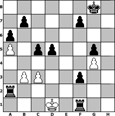 game notation in PGN-format [Event "unter uns Nr. 41 (Advendturnier 2017)"] [Site "www.myChess.de"] [Date "2017.11.29"] [Round "1"] [White "Achimkogge"] [Black "borsti"] [ECO "D00"] [WhitemyELO "1337"] [BlackmyELO "1234"] [Result "0-1"] [TimeControl "10/864000"] [WhiteDays "47"] [BlackDays "49"] [MyChessNo "110522"] 1. d4 d5 2. c3 Bg4 3. h3 Bh5 4. g4 Bg6 5. Na3 e6 6. Bf4 Bd6 7. Be3 Nf6 8. Bg5 h6 9. Bh4 Be7 10. e3 Ne4 11. Bxe7 Qxe7 12. Nf3 Nc6 13. Bb5 Qd6 14. Ne5 O-O 15. Bd3 Nxe5 16. dxe5 Qxe5 17. f4 Qd6 18. Nb5 Qb6 19. a4 Qxe3+ 20. Qe2 Qg3+ 21. Kd1 Nf2+ 22. Kc2 Bxd3+ 23. Qxd3 Qxd3+ 24. Kb3 Qc4+ 25. Kc2 Qd3+ 26. Kb3 Nxh3 27. Nd4 Nxf4 28. Rhd1 Qc4+ 29. Kc2 Ng2 30. Rd3 Rfe8 31. b3 Qxd3+ 32. Kxd3 Rac8 33. Nb5 a6 34. Nd4 c5 35. Ne2 e5 36. Rg1 Nf4+ 37. Nxf4 exf4 38. Rf1 Re3+ 39. Kd2 g5 40. a5 Rce8 41. Rh1 Re2+ 42. Kd1 Rg2 43. Rxh6 f3 44. Rh1 Ree2 45. Rf1 Ra2 46. Rf2 Rg1+ 47. Rf1 Rxf1# 0-1 position notation in FEN-format 6k1/1p3p2/p7/P1pp2p1/6P1/1PP2p2/r7/3K1r2 - - - 0 48 Captured white pieces: Captured black pieces: Click on a captured piece in order to display the desired move!