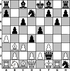 game notation in PGN-format [Event "f"] [Site "www.myChess.de"] [Date "2005.12.25"] [Round "1"] [White "stierdame1965"] [Black "Antaeus"] [ECO "B01"] [WhitemyELO "925"] [BlackmyELO "1493"] [Result "0-1"] [TimeControl "10/864000"] [WhiteDays "10"] [BlackDays "10"] [MyChessNo "21161"] 1. e4 d5 2. Bd3 d4 3. c3 e5 4. Bb5+ c6 5. Ba4 b5 6. Bb3 Nf6 7. Nf3 Nbd7 8. Nh4 g6 9. a4 Nxe4 10. f3 Qxh4+ 11. g3 Nxg3 12. Rg1 Nh1+ 13. Kf1 Qf2# 0-1 position notation in FEN-format r1b1kb1r/p2n1p1p/2p3p1/1p2p3/P2p4/1BP2P2/1P1PPq1P/RNBQ1KRn - kq - 4 14 Captured white pieces: Captured black pieces: Click on a captured piece in order to display the desired move!