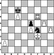 game notation in PGN-format [Event "Winter 2011/12"] [Site "www.myChess.de"] [Date "2011.12.22"] [Round "2"] [White "Jolilein"] [Black "Lemmi11"] [ECO "A25"] [WhitemyELO "1906"] [BlackmyELO "1813"] [Result "1-0"] [TimeControl "10/2592000"] [WhiteDays "151"] [BlackDays "179"] [MyChessNo "78419"] 1. c4 e5 2. Nc3 Nc6 3. e4 Bc5 4. Nf3 d6 5. d3 Nf6 6. Bg5 h6 7. Be3 O-O 8. Be2 Nd4 9. O-O c6 10. Na4 Nxe2+ 11. Qxe2 Bxe3 12. Qxe3 b5 13. cxb5 cxb5 14. Nc3 b4 15. Ne2 Qb6 16. Ng3 Qxe3 17. fxe3 Ba6 18. Rfd1 Rac8 19. Nf5 Rc2 20. b3 g6 21. Nxd6 Rd8 22. Nc4 Bxc4 23. bxc4 Ng4 24. Rdb1 Nxe3 25. Ne1 Re2 26. Rxb4 Rd6 27. h3 Rf6 28. Rbb1 Rf1+ 29. Kh2 Rexe1 30. Rxe1 Rxe1 31. Rxe1 Nc2 32. c5 Nd4 33. Rb1 Kg7 34. Rb7 a5 35. Rb6 Kf8 36. Ra6 h5 37. Rxa5 Ke8 38. Ra6 Ne6 39. c6 Kd8 40. Ra7 f6 41. Rf7 Nc5 42. Kg3 Kc8 43. Rxf6 Kc7 44. Rxg6 Nxd3 45. Rh6 Nc5 46. Kf3 Kb6 47. Rxh5 Nd3 48. Rh6 Nb4 49. g4 Nd3 50. g5 Nf4 51. h4 Kc7 52. Rf6 1-0 position notation in FEN-format 8/2k5/2P2R2/4p1P1/4Pn1P/5K2/P7/8 - - - 2 52 Captured white pieces: Captured black pieces: Click on a captured piece in order to display the desired move!