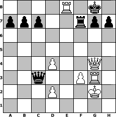 game notation in PGN-format [Event "Hobbyschach"] [Site "www.myChess.de"] [Date "2004.06.26"] [Round "2"] [White "Falcor"] [Black "MStr"] [ECO "D06"] [WhitemyELO "1322"] [BlackmyELO "1419"] [Result "1-0"] [TimeControl "10/1728000"] [WhiteDays "73"] [BlackDays "56"] [MyChessNo "5419"] 1. d4 d5 2. c4 Nf6 3. Nc3 e6 4. Bg5 Be7 5. Nf3 dxc4 6. e3 Nc6 7. Bxc4 Nb4 8. a3 Nbd5 9. O-O Nxc3 10. bxc3 O-O 11. Qd3 Ng4 12. Bxe7 Qxe7 13. e4 Bd7 14. h3 Nf6 15. e5 Nh5 16. Rab1 Bc6 17. Qe3 Qxa3 18. Rb3 Qe7 19. Bd3 f6 20. g4 fxe5 21. Nxe5 Bd5 22. Rb2 Nf4 23. Kh2 Bg2 24. Rg1 Bxh3 25. Rg3 Bxg4 26. Rxg4 Nxd3 27. Qxd3 Rf5 28. Qh3 Raf8 29. Kg2 Qa3 30. Re2 Qb3 31. Rg3 Qd5+ 32. f3 Qb3 33. Qg4 R8f7 34. Nxf7 Rxf7 35. Rxe6 Qxc3 36. Re8+ 1-0 position notation in FEN-format 4R1k1/ppp2rpp/8/8/3P2Q1/2q2PR1/3P2K1/8 - - - 1 36 Captured white pieces: Captured black pieces: Click on a captured piece in order to display the desired move!