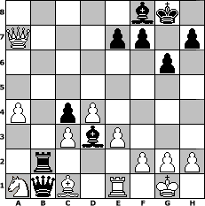 game notation in PGN-format [Event "Sommerpause"] [Site "www.myChess.de"] [Date "2011.06.29"] [Round "1"] [White "Steffi"] [Black "ndziemba"] [ECO "D20"] [WhitemyELO "1525"] [BlackmyELO "1531"] [Result "0-1"] [TimeControl "10/864000"] [WhiteDays "03"] [BlackDays "10"] [MyChessNo "74756"] 1. d4 d5 2. c4 dxc4 3. Nc3 Nf6 4. Nf3 g6 5. e3 Bg7 6. Bxc4 O-O 7. O-O Bf5 8. Qb3 Nc6 9. Qxb7 Na5 10. Qa6 Nxc4 11. Qxc4 Be6 12. Qe2 Qd6 13. Rd1 Nd5 14. a3 Nxc3 15. bxc3 c5 16. Bb2 Rab8 17. Rac1 Bb3 18. Rd2 c4 19. Ne1 Rfc8 20. Nc2 Bh6 21. Na1 Ba2 22. Re1 Rb5 23. Bc1 Bb1 24. Rb2 Bd3 25. Qd2 Rxb2 26. Qxb2 Rb8 27. Qa2 Qb6 28. a4 Qb1 29. Qa3 Bf8 30. Bd2 Qb2 31. Bc1 Qb7 32. Qc5 Qb1 33. Qxa7 Rb2 0-1 position notation in FEN-format 5bk1/Q3pp1p/6p1/8/P1pP4/2PbP3/1r3PPP/NqB1R1K1 - - - 1 34 Captured white pieces: Captured black pieces: Click on a captured piece in order to display the desired move!