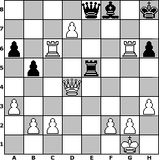 | game notation in PGN-format [Event "Mail"] [Site "www.myChess.de"] [Date "2012.05.01"] [Round "1"] [White "Winston"] [Black "hape50"] [ECO "C00"] [WhitemyELO "1478"] [BlackmyELO "1265"] [Result "1-0"] [TimeControl "10/864000"] [WhiteDays "10"] [BlackDays "10"] [MyChessNo "81416"] 1. e4 e6 2. Nf3 h6 3. a3 d6 4. Nc3 a6 5. Bc4 Nc6 6. O-O Nf6 7. Re1 Be7 8. d4 b5 9. Ba2 Bb7 10. d5 Ne5 11. dxe6 fxe6 12. Bxe6 Bc8 13. Bd5 Rb8 14. Bf4 c6 15. Bxe5 cxd5 16. Bxf6 gxf6 17. exd5 O-O 18. Nd4 Bd7 19. Re3 Kh7 20. Qd3+ Kh8 21. Re1 Rf7 22. Nce2 Bf8 23. Nf4 Rg7 24. Nfe6 Bxe6 25. Nxe6 Qd7 26. Nxg7 Qxg7 27. Rg3 Qh7 28. Qc3 Qf5 29. Qd2 Qh7 30. Re6 Be7 31. Rh3 Bf8 32. Rxf6 Kg8 33. Rg3+ Kh8 34. Rgg6 Re8 35. h3 Bg7 36. Rxd6 Bf8 37. Rc6 Re5 38. Qd4 Qe7 39. d6 Qe8 40. d7 1-0 position notation in FEN-format 4qb1k/3P4/p1R3Rp/1p2r3/3Q4/P6P/1PP2PP1/6K1 - - - 0 40 Captured white pieces:                              Captured black pieces:                               Click on a captured piece in order to display the desired move!