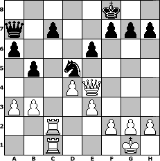 game notation in PGN-format [Event "Sommersonne "] [Site "www.myChess.de"] [Date "2016.05.14"] [Round "1"] [White "Steffi"] [Black "reisinger"] [ECO "A50"] [WhitemyELO "1551"] [BlackmyELO "1515"] [Result "1-0"] [TimeControl "10/2592000"] [WhiteDays "47"] [BlackDays "90"] [MyChessNo "103657"] 1. d4 Nf6 2. c4 d5 3. Nc3 e6 4. Nf3 a6 5. e3 Bb4 6. Bd2 O-O 7. a3 Bxc3 8. Bxc3 dxc4 9. Bxc4 b5 10. Be2 Bb7 11. O-O Qe7 12. Bb4 Qd8 13. Bxf8 Kxf8 14. Ne5 Nc6 15. Bf3 Nxe5 16. Bxb7 Nc4 17. Bxa8 Qxa8 18. b3 Nd6 19. Rc1 Qb7 20. Qf3 Nde4 21. Rc2 Qa7 22. Rfc1 Nd5 23. Qxe4 1-0 position notation in FEN-format 5k2/q1p2ppp/p3p3/1p1n4/3PQ3/PP2P3/2R2PPP/2R3K1 - - - 0 23 Captured white pieces: Captured black pieces: Click on a captured piece in order to display the desired move!