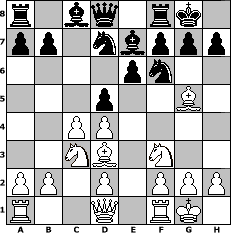 game notation in PGN-format [Event "Faires Schach"] [Site "www.myChess.de"] [Date "2007.03.25"] [Round "1"] [White "Greenhorn"] [Black "Erwino123"] [ECO "D37"] [WhitemyELO "1678"] [BlackmyELO "1505"] [Result "1-0"] [TimeControl "10/3456000"] [WhiteDays "37"] [BlackDays "00"] [MyChessNo "33748"] 1. d4 d5 2. c4 e6 3. Nc3 Nf6 4. Nf3 Nbd7 5. Bg5 Be7 6. e3 O-O 7. Bd3 c5 8. O-O cxd4 9. exd4 1-0 position notation in FEN-format r1bq1rk1/pp1nbppp/4pn2/3p2B1/2PP4/2NB1N2/PP1P1PPP/R2Q1RK1 - - - 0 9 Captured white pieces: Captured black pieces: Click on a captured piece in order to display the desired move!
