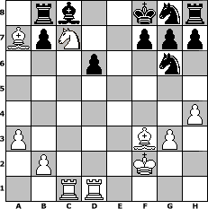 game notation in PGN-format [Event "Auf ein Neues 2"] [Site "www.myChess.de"] [Date "2021.03.20"] [Round "1"] [White "nyffhans"] [Black "sprinterde"] [ECO "C47"] [WhitemyELO "2086"] [BlackmyELO "1645"] [Result "1-0"] [TimeControl "10/2592000"] [WhiteDays "87"] [BlackDays "89"] [MyChessNo "121568"] 1. e4 e5 2. Nf3 Nc6 3. Nc3 Nf6 4. a3 Bc5 5. Nxe5 Bxf2+ 6. Kxf2 Nxe5 7. d4 Ng6 8. e5 Ng8 9. Qf3 Qh4+ 10. g3 Qxd4+ 11. Be3 Qxe5 12. Nb5 Kf8 13. Bd4 Qg5 14. h4 Qd2+ 15. Be2 d6 16. Rhd1 Qxc2 17. Rac1 Qf5 18. Nxc7 Qxf3+ 19. Bxf3 Rb8 20. Bxa7 1-0 position notation in FEN-format 1rb2knr/BpN2ppp/3p2n1/8/7P/P4BP1/1P3K2/2RR4 - - - 0 20 Captured white pieces: Captured black pieces: Click on a captured piece in order to display the desired move!