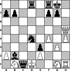game notation in PGN-format [Event "Herbstturnier bis 1600"] [Site "www.myChess.de"] [Date "2025.10.14"] [Round "1"] [White "Achimkogge"] [Black "Campino1986"] [ECO "D00"] [WhitemyELO "1226"] [BlackmyELO "1558"] [Result "0-1"] [TimeControl "10/2592000"] [WhiteDays "87"] [BlackDays "88"] [MyChessNo "133741"] 1. d4 d5 2. c3 Nf6 3. Nd2 Bf5 4. f3 e6 5. b4 Bd6 6. g3 e5 7. dxe5 Bxe5 8. Qa4+ Qd7 9. b5 Bxc3 10. Rb1 Bxb1 11. Kd1 d4 12. Nxb1 Nd5 13. Bh3 Qd6 14. b6+ Nc6 15. bxc7 Qxc7 16. Qb5 Rd8 17. Bf5 O-O 18. Be4 Ne3+ 19. Bxe3 dxe3+ 20. Bd3 Nd4 21. Bxh7+ Kxh7 22. Qh5+ Kg8 23. f4 Bb2 24. h4 Qc1# 0-1 position notation in FEN-format 3r1rk1/pp3pp1/8/7Q/3n1P1P/4p1P1/Pb2P3/1NqK2NR - - - 1 25 Captured white pieces: Captured black pieces: Click on a captured piece in order to display the desired move!