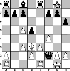 game notation in PGN-format [Event ""] [Site "www.myChess.de"] [Date "2005.07.20"] [Round "2"] [White "thello"] [Black "Knight"] [ECO "?"] [WhitemyELO "1480"] [BlackmyELO "1466"] [Result "1/2-1/2"] [TimeControl "10/864000"] [WhiteDays "20"] [BlackDays "20"] [MyChessNo "15224"] 1. d4 Nf6 2. c4 e6 3. Nc3 d5 4. Bg5 Bb4 5. e3 Nc6 6. c5 O-O 7. Bd3 Bxc3+ 8. bxc3 h6 9. Bxf6 Qxf6 10. Nf3 Re8 11. O-O e5 12. dxe5 Nxe5 13. Nxe5 Qxe5 14. Qc2 Qg5 15. f4 Qe7 16. Rfe1 Qh4 17. Qf2 Qxf2+ 1/2-1/2 position notation in FEN-format r1b1r1k1/ppp2pp1/7p/2Pp4/5P2/2PBP3/P2P1qPP/R3R1K1 - - - 0 18 Captured white pieces: ![]() ![]() ![]() ![]() ![]() ![]() ![]() ![]() ![]() ![]() ![]() ![]() ![]() ![]() ![]() Captured black pieces: ![]() ![]() ![]() ![]() ![]() ![]() ![]() ![]() ![]() ![]() ![]() ![]() ![]() ![]() ![]() Click on a captured piece in order to display the desired move!