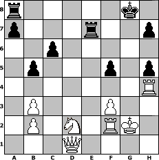 game notation in PGN-format [Event "Regensommer"] [Site "www.myChess.de"] [Date "2012.06.20"] [Round "1"] [White "BobbyF4"] [Black "Schachboy1"] [ECO "B10"] [WhitemyELO "1519"] [BlackmyELO "1571"] [Result "1-0"] [TimeControl "10/1728000"] [WhiteDays "20"] [BlackDays "18"] [MyChessNo "82377"] 1. e4 c6 2. e5 g6 3. Bc4 d5 4. exd6 exd6 5. Ne2 d5 6. Bb3 Bg7 7. d4 Ne7 8. O-O O-O 9. Bg5 f6 10. Bd2 Nf5 11. c3 Re8 12. Bf4 Nd6 13. h3 b6 14. Nd2 Na6 15. f3 Bb7 16. Ng3 Nc7 17. h4 Ne6 18. Bxd6 Qxd6 19. Ne2 f5 20. g3 Ba6 21. c4 Nxd4 22. Nf4 Be5 23. Rf2 Bxf4 24. gxf4 Qxf4 25. h5 Re6 26. cxd5 Re7 27. d6+ Nxb3 28. axb3 Qxd6 29. Rxa6 Qg3+ 30. Kf1 Qh4 31. Kg2 gxh5 32. Ra4 b5 33. Rxh4 1-0 position notation in FEN-format r5k1/p3r2p/2p5/1p3p1p/7R/1P3P2/1P1N1RK1/3Q4 - - - 0 33 Captured white pieces: Captured black pieces: Click on a captured piece in order to display the desired move!