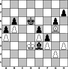 game notation in PGN-format [Event "Faires Schach"] [Site "www.myChess.de"] [Date "2007.03.25"] [Round "1"] [White "Anonymus"] [Black "Andreas"] [ECO "A04"] [WhitemyELO "1586"] [BlackmyELO "1619"] [Result "1/2-1/2"] [TimeControl "10/3456000"] [WhiteDays "128"] [BlackDays "155"] [MyChessNo "33739"] 1. Nf3 d6 2. d4 e6 3. c4 g6 4. Nc3 Bg7 5. e4 Ne7 6. Bd3 O-O 7. O-O b6 8. Qc2 Nbc6 9. Be3 Nb4 10. Qd2 Nxd3 11. Qxd3 Nc6 12. a3 Bb7 13. b4 a6 14. d5 Ne5 15. Nxe5 dxe5 16. Rfd1 exd5 17. Nxd5 Bxd5 18. Qxd5 Qe7 19. Qd7 Rfe8 20. Qxe7 Rxe7 21. Rd5 f5 22. f3 f4 23. Bf2 a5 24. b5 Kf7 25. Rad1 Rae8 26. Rd7 Rxd7 27. Rxd7+ Re7 28. Rxe7+ Kxe7 29. Kf1 Kd7 30. a4 Bf8 31. Ke2 Be7 32. Kd3 Bb4 33. h3 Kd6 34. Bh4 Bc5 35. Be1 c6 36. Bh4 cxb5 37. cxb5 Bd4 38. Bg5 Be3 1/2-1/2 position notation in FEN-format 8/7p/1p1k2p1/pP2p1B1/P3Pp2/3KbP1P/6P1/8 - - - 3 39 Captured white pieces: Captured black pieces: Click on a captured piece in order to display the desired move!