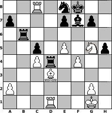 game notation in PGN-format [Event "2. Chess960/1"] [Site "www.myChess.de"] [Date "2008.03.15"] [Round "1"] [White "BirdofPray1"] [Black "Heinz@"] [Variant "Fischerrandom"] [SetUp "1"] [FEN "rqnbbknr/pppppppp/8/8/8/8/PPPPPPPP/RQNBBKNR w KQkq - 0 1"] [WhitemyELO "2240"] [BlackmyELO "1500"] [Result "1-0"] [TimeControl "10/3456000"] [WhiteDays "120"] [BlackDays "117"] [MyChessNo "43400"] 1. c4 Nf6 2. d4 d6 3. Nf3 c5 4. dxc5 dxc5 5. Nd3 Nd6 6. O-O Bb6 7. b3 Nde4 8. Bc2 Bc7 9. b4 b6 10. bxc5 bxc5 11. Qxb8 Rxb8 12. Nfe5 Ng5 13. f3 Ne6 14. e3 Ng8 15. Bg3 f6 16. Ng4 Bxg3 17. hxg3 h5 18. Ngf2 Rc8 19. Rab1 Nh6 20. Nf4 Nxf4 21. gxf4 Nf7 22. Ne4 f5 23. Ng5 Nd6 24. Bd3 Bf7 25. Rfc1 Rd8 26. e4 fxe4 27. fxe4 Ne8 28. Rd1 Rh6 29. e5 Rd4 30. Rb8 Rb6 31. Rc8 1-0 position notation in FEN-format 2R1nk2/p3pbp1/1r6/2p1P1Np/2Pr1P2/3B4/P5P1/3R2K1 - - - 4 31 Captured white pieces: Captured black pieces: Click on a captured piece in order to display the desired move!