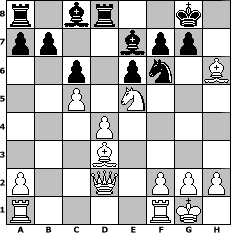 | game notation in PGN-format [Event "Winterturnier"] [Site "www.myChess.de"] [Date "2009.11.12"] [Round "1"] [White "leitsgeheier"] [Black "RashimIbenRohal"] [ECO "B17"] [WhitemyELO "1527"] [BlackmyELO "1524"] [Result "1-0"] [TimeControl "10/3456000"] [WhiteDays "52"] [BlackDays "76"] [MyChessNo "60552"] 1. e4 c6 2. d4 d5 3. Nc3 dxe4 4. Nxe4 Nd7 5. Bc4 Ngf6 6. Ng5 e6 7. Qe2 Nb6 8. Bd3 Be7 9. N1f3 h6 10. Ne4 Nbd5 11. Nxf6+ Nxf6 12. O-O O-O 13. c4 Qc7 14. Ne5 Bd7 15. Bf4 Qb6 16. c5 Qxb2 17. Qxb2 Bc8 18. Qd2 Rd8 19. Bxh6 1-0 position notation in FEN-format r1br2k1/pp2bpp1/2p1pn1B/2P1N3/3P4/3B4/P2Q1PPP/R4RK1 - - - 0 19 Captured white pieces:                              Captured black pieces:                               Click on a captured piece in order to display the desired move!