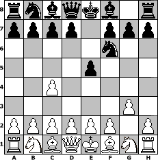 game notation in PGN-format [Event "Regensommer"] [Site "www.myChess.de"] [Date "2012.06.20"] [Round "1"] [White "Duschgel"] [Black "Schachboy1"] [ECO "A20"] [WhitemyELO "1572"] [BlackmyELO "1571"] [Result "0-1"] [TimeControl "10/1728000"] [WhiteDays "00"] [BlackDays "20"] [MyChessNo "82383"] 1. c4 e5 2. g3 Nf6 0-1 position notation in FEN-format rnbqkb1r/pppp1ppp/5n2/4p3/2P5/6P1/PPPPPP1P/RNBQKBNR - KQkq - 1 3 Captured white pieces: Captured black pieces: Click on a captured piece in order to display the desired move!
