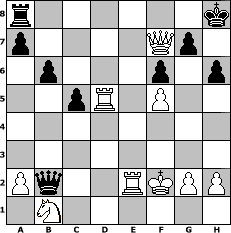 game notation in PGN-format [Event "°°°°``Der sch"] [Site "www.myChess.de"] [Date "2009.05.11"] [Round "1"] [White "murphy12"] [Black "Andylein1989"] [ECO "A00"] [WhitemyELO "1580"] [BlackmyELO "1587"] [Result "1-0"] [TimeControl "10/864000"] [WhiteDays "40"] [BlackDays "32"] [MyChessNo "55556"] 1. Nc3 Nf6 2. d4 d5 3. Bg5 e6 4. e4 c6 5. e5 Be7 6. f4 Ne4 7. Nxe4 dxe4 8. Nh3 Bxg5 9. Nxg5 h6 10. Nxe4 O-O 11. Nd6 b6 12. Bd3 Ba6 13. c4 Nd7 14. O-O c5 15. d5 exd5 16. cxd5 Bxd3 17. Qxd3 Qc7 18. Rac1 f6 19. Nb5 Qd8 20. e6 Nb8 21. d6 Nc6 22. e7 Nxe7 23. Qc4+ Kh8 24. dxe7 Qxe7 25. Rfe1 Qd7 26. Rcd1 Qf5 27. Rd5 Qg6 28. f5 Qf7 29. Nd6 Qh5 30. Qe2 Qg5 31. Qe7 Qh4 32. Re4 Qg5 33. Nf7+ Rxf7 34. Qxf7 Qc1+ 35. Kf2 Qxb2+ 36. Re2 1-0 position notation in FEN-format r6k/p4Qp1/1p3p1p/2pR1P2/8/8/Pq2RKPP/1N6 - - - 1 36 Captured white pieces: Captured black pieces: Click on a captured piece in order to display the desired move!