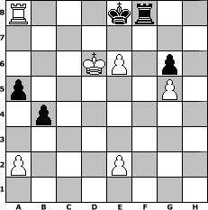 game notation in PGN-format [Event "Vor dem Urlaub noch ein schnelles Turnier!"] [Site "www.myChess.de"] [Date "2012.06.16"] [Round "1"] [White "Sanji"] [Black "lotchi"] [ECO "C57"] [WhitemyELO "1547"] [BlackmyELO "1192"] [Result "1-0"] [TimeControl "10/864000"] [WhiteDays "03"] [BlackDays "02"] [MyChessNo "82268"] 1. e4 e5 2. Nf3 Nc6 3. Bc4 Nf6 4. Ng5 d5 5. exd5 Nxd5 6. d4 Be6 7. Nxe6 fxe6 8. O-O g6 9. dxe5 Bg7 10. f4 a6 11. Bxd5 exd5 12. Nc3 d4 13. Ne4 O-O 14. Qg4 Qc8 15. Qh4 Qd8 16. Qxd8 Raxd8 17. Ng5 Rde8 18. Bd2 h6 19. Ne4 a5 20. Rad1 Rd8 21. Nf2 h5 22. Nd3 b6 23. c3 dxc3 24. Bxc3 Kh7 25. g3 Ne7 26. Kg2 c5 27. Nf2 Nd5 28. Ne4 Nxc3 29. Nxc3 Rxd1 30. Rxd1 Rb8 31. Rd7 Kh6 32. e6 Bxc3 33. bxc3 Re8 34. Rd6 b5 35. Kf3 b4 36. cxb4 cxb4 37. h3 Kg7 38. g4 hxg4+ 39. hxg4 Kf6 40. g5+ Ke7 41. Ra6 Rc8 42. Ke4 Rc4+ 43. Kd5 Rxf4 44. Ra7+ Ke8 45. Ke5 Rf5+ 46. Kd6 Rf8 47. Ra8# 1-0 position notation in FEN-format R3kr2/8/3KP1p1/p5P1/1p6/8/P3P3/8 - - - 7 47 Captured white pieces: Captured black pieces: Click on a captured piece in order to display the desired move!