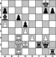 game notation in PGN-format [Event "reisinger"] [Site "www.myChess.de"] [Date "2010.08.09"] [Round "2"] [White "Joschi"] [Black "woern63"] [ECO "A92"] [WhitemyELO "1568"] [BlackmyELO "1514"] [Result "0-1"] [TimeControl "10/1728000"] [WhiteDays "20"] [BlackDays "20"] [MyChessNo "67565"] 1. d4 f5 2. c4 Nf6 3. g3 e6 4. Bg2 Be7 5. Nf3 O-O 6. O-O Ne4 7. Nc3 Bf6 8. e3 d5 9. cxd5 exd5 10. Nd2 c6 11. Ndxe4 fxe4 12. b3 Qe7 13. a4 Qf7 14. Ba3 Be7 15. b4 Nd7 16. b5 Bxa3 17. Rxa3 Nf6 18. bxc6 bxc6 19. Qc2 Ba6 20. Rc1 Rac8 21. a5 Ng4 22. Nd1 Nxh2 23. Kxh2 Qh5+ 24. Kg1 Rf6 25. Nb2 Rh6 26. Nd3 Qh2+ 27. Kf1 Rf8 28. Ke1 exd3 29. Rxd3 Qxg2 30. Rc3 Rh1+ 31. Kd2 Rxf2# 0-1 position notation in FEN-format 6k1/p5pp/b1p5/P2p4/3P4/2R1P1P1/2QK1rq1/2R4r - - - 0 32 Captured white pieces: Captured black pieces: Click on a captured piece in order to display the desired move!