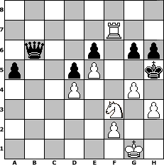 game notation in PGN-format [Event "Mitten ins Gr"] [Site "www.myChess.de"] [Date "2015.05.11"] [Round "1"] [White "Gauss1233"] [Black "borsti"] [ECO "D20"] [WhitemyELO "1407"] [BlackmyELO "1334"] [Result "1-0"] [TimeControl "10/1728000"] [WhiteDays "76"] [BlackDays "80"] [MyChessNo "99175"] 1. d4 d5 2. c4 dxc4 3. Qa4+ c6 4. Qxc4 Be6 5. Qd3 Nf6 6. e4 Na6 7. Nc3 Bg4 8. h3 Bh5 9. e5 Nd5 10. Be2 Bg6 11. Qd2 e6 12. Bxa6 bxa6 13. Nf3 Bb4 14. a3 Ba5 15. O-O Rb8 16. b4 Bb6 17. Nxd5 cxd5 18. Bb2 O-O 19. Rfc1 Qd7 20. a4 h6 21. a5 Bd8 22. Ba3 Re8 23. Qc3 Be7 24. Ra2 Rec8 25. Qb2 Qb5 26. Rxc8+ Rxc8 27. Nd2 Rc2 28. Qxc2 Bxc2 29. Rxc2 Kh7 30. Rc7 Bxb4 31. Bxb4 Qxb4 32. Nf3 Qxa5 33. Rxa7 Kg6 34. g3 Qb6 35. Re7 a5 36. Nh4+ Kg5 37. Rxf7 g6 38. Nf3+ Kh5 39. g4# 1-0 position notation in FEN-format 8/5R2/1q2p1pp/p2pP2k/3P2P1/5N1P/5P2/6K1 - - - 0 39 Captured white pieces: Captured black pieces: Click on a captured piece in order to display the desired move!