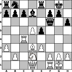 game notation in PGN-format [Event "Der T"] [Site "www.myChess.de"] [Date "2010.05.02"] [Round "1"] [White "muetoe"] [Black "WalterKelsch7"] [ECO "D30"] [WhitemyELO "1877"] [BlackmyELO "1761"] [Result "1-0"] [TimeControl "10/2592000"] [WhiteDays "30"] [BlackDays "11"] [MyChessNo "65227"] 1. d4 d5 2. c4 e6 3. Nf3 Nf6 4. Bg5 Bb4+ 5. Nc3 O-O 6. e3 h6 7. Bxf6 Qxf6 8. Rc1 Nc6 9. a3 Bxc3+ 10. Rxc3 Re8 11. Bd3 dxc4 12. Rxc4 Bd7 13. O-O e5 14. d5 Nb8 15. Nd2 1-0 position notation in FEN-format rn2r1k1/pppb1pp1/5q1p/3Pp3/2R5/P2BP3/1P1N1PPP/3Q1RK1 - - - 2 15 Captured white pieces: Captured black pieces: Click on a captured piece in order to display the desired move!