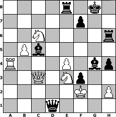 game notation in PGN-format [Event "960-Sommercup 2016"] [Site "www.myChess.de"] [Date "2016.06.10"] [Round "1"] [White "muetoe"] [Black "Erich"] [Variant "Fischerrandom"] [SetUp "1"] [FEN "qnrnbbkr/pppppppp/8/8/8/8/PPPPPPPP/QNRNBBKR w KQkq - 0 1"] [WhitemyELO "1979"] [BlackmyELO "2115"] [Result "0-1"] [TimeControl "10/2592000"] [WhiteDays "30"] [BlackDays "30"] [MyChessNo "103814"] 1. e4 e5 2. b4 d6 3. d4 exd4 4. Qxd4 Ne6 5. Qd3 Bd7 6. Bc3 b5 7. Ne3 Nf4 8. Qd4 Re8 9. f3 a6 10. a3 Nc6 11. Qd2 Ne5 12. Bxe5 Rxe5 13. g3 Nh3+ 14. Bxh3 Bxh3 15. Nc3 c6 16. Ne2 g5 17. c4 h5 18. Nd4 Rh6 19. cxb5 c5 20. Nc6 Re8 21. a4 axb5 22. axb5 g4 23. Kf2 gxf3 24. Ra1 Qb7 25. Qd3 Be6 26. Ra7 Qb6 27. Ra6 Qb7 28. bxc5 dxc5 29. Rb1 c4 30. Qd4 Qd7 31. Ra4 c3 32. Qxc3 Bc5 33. Rba1 h4 34. g4 Bxg4 35. Rd1 Qxd1 0-1 position notation in FEN-format 4r1k1/5p2/2N4r/1Pb5/R3P1bp/2Q1Np2/5K1P/3q4 - - - 0 36 Captured white pieces: Captured black pieces: Click on a captured piece in order to display the desired move!