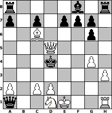 game notation in PGN-format [Event "?"] [Site "www.myChess.de"] [Date "2023.11.06"] [Round "?"] [White "pillepalle"] [Black "Achimkogge"] [ECO "D00"] [WhitemyELO "2047"] [BlackmyELO "1297"] [Result "1-0"] [TimeControl "10/1728000"] [WhiteDays "40"] [BlackDays "38"] [MyChessNo "130982"] 1. d4 d5 2. e4 dxe4 3. Nc3 Nf6 4. f3 exf3 5. Nxf3 Bg4 6. h3 Bh5 7. g4 Bg6 8. Ne5 Ne4 9. Qf3 Qxd4 10. Nxg6 hxg6 11. Be3 Qb4 12. Qxe4 Qxb2 13. Nd1 Qxa1 14. Qxb7 Kd7 15. Bb5+ Nc6 16. Bxc6+ Kd6 17. Bc5+ Kxc5 18. Qb5+ Kd4 19. Qd5# 1-0 position notation in FEN-format r4b1r/p1p1ppp1/2B3p1/3Q4/3k2P1/7P/P1PP4/q2NK2R - KQ - 3 19 Captured white pieces: Captured black pieces: Click on a captured piece in order to display the desired move!
