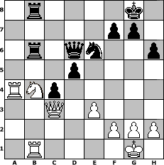 game notation in PGN-format [Event "CAISSA.COM IS DEAD TO ME!"] [Site "www.myChess.de"] [Date "2020.03.28"] [Round "2"] [White "kalle"] [Black "deepsabel"] [ECO "D61"] [WhitemyELO "1648"] [BlackmyELO "1816"] [Result "0-1"] [TimeControl "10/2592000"] [WhiteDays "30"] [BlackDays "30"] [MyChessNo "117723"] 1. d4 d5 2. c4 e6 3. Nc3 Nf6 4. Bg5 Be7 5. e3 O-O 6. Nf3 Nbd7 7. Qc2 c6 8. Bd3 Re8 9. Ne5 h6 10. Bf4 dxc4 11. Nxc4 Nd5 12. Nxd5 exd5 13. Nd2 Nf8 14. a3 Bd6 15. Bxd6 Qxd6 16. b4 a6 17. Nb3 Bg4 18. Nc5 Re7 19. O-O Bh5 20. a4 Rae8 21. Rfb1 Bg6 22. b5 axb5 23. axb5 Bxd3 24. Qxd3 b6 25. Na6 c5 26. dxc5 bxc5 27. b6 c4 28. Qc3 Rb7 29. Ra5 Rxb6 30. Nb4 Reb8 31. Ra4 Ne6 0-1 position notation in FEN-format 1r4k1/5pp1/1r1qn2p/3p4/RNp5/2Q1P3/5PPP/1R4K1 - - - 4 32 Captured white pieces: Captured black pieces: Click on a captured piece in order to display the desired move!