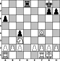 game notation in PGN-format [Event "Herbst 2022"] [Site "www.myChess.de"] [Date "2022.10.06"] [Round "1"] [White "Ziegert"] [Black "Lohl"] [ECO "C70"] [WhitemyELO "2064"] [BlackmyELO "1412"] [Result "1-0"] [TimeControl "10/2592000"] [WhiteDays "38"] [BlackDays "90"] [MyChessNo "127465"] 1. e4 e5 2. Nf3 Nc6 3. Bb5 a6 4. Ba4 b5 5. Bb3 Nf6 6. d4 exd4 7. O-O Nxe4 8. Nxd4 Ne5 9. Bd5 c6 10. Bxe4 d5 11. Nxc6 Qc7 12. Qxd5 Be6 13. Qxe5 Qxe5 14. Nxe5 Bd6 15. Bxa8 O-O 16. Nxf7 Rxa8 17. Nxd6 Rd8 18. Bf4 Bc4 19. Nxc4 bxc4 20. Nc3 1-0 position notation in FEN-format 3r2k1/6pp/p7/8/2p2B2/2N5/PPP1PPPP/R4RK1 - - - 1 20 Captured white pieces: Captured black pieces: Click on a captured piece in order to display the desired move!