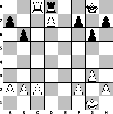 game notation in PGN-format [Event "Wintereinbruch"] [Site "www.myChess.de"] [Date "2015.10.18"] [Round "1"] [White "Wernburger"] [Black "Joschi"] [ECO "A16"] [WhitemyELO "1836"] [BlackmyELO "1606"] [Result "1-0"] [TimeControl "10/1728000"] [WhiteDays "48"] [BlackDays "60"] [MyChessNo "100816"] 1. c4 Nf6 2. Nc3 c5 3. g3 d5 4. cxd5 Nxd5 5. Bg2 e6 6. e3 Be7 7. Nge2 O-O 8. O-O Nc6 9. d4 cxd4 10. Nxd5 exd5 11. Nxd4 Nxd4 12. Qxd4 Be6 13. Bd2 Bf6 14. Qb4 b6 15. Bc3 Bxc3 16. Qxc3 Qe7 17. Qd4 Rfd8 18. Rac1 Rac8 19. Rxc8 Rxc8 20. Bxd5 Rd8 21. e4 Kh8 22. Qe5 Qe8 23. Rc1 Bxd5 24. Qxe8+ Rxe8 25. exd5 Kg8 26. d6 g6 27. d7 Rd8 28. Rc8 1-0 position notation in FEN-format 2Rr2k1/p2P1p1p/1p4p1/8/8/6P1/PPP2P1P/6K1 - - - 2 28 Captured white pieces: Captured black pieces: Click on a captured piece in order to display the desired move!