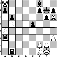 | game notation in PGN-format [Event "Winterturnier"] [Site "www.myChess.de"] [Date "2009.11.12"] [Round "1"] [White "Rotstift10"] [Black "sprinterde"] [ECO "A42"] [WhitemyELO "1557"] [BlackmyELO "1558"] [Result "1-0"] [TimeControl "10/3456000"] [WhiteDays "143"] [BlackDays "158"] [MyChessNo "60595"] 1. d4 d6 2. c4 Nf6 3. Nc3 g6 4. h3 Bg7 5. Nf3 c6 6. e4 Qa5 7. Bd2 Qb6 8. Qc2 O-O 9. Na4 Qc7 10. Bd3 Nbd7 11. O-O c5 12. Bc3 cxd4 13. Bxd4 e5 14. Be3 b6 15. b4 Bb7 16. a3 Rac8 17. Nb2 d5 18. Nd2 dxc4 19. Qxc4 Qd6 20. Qb3 Qc6 21. Rac1 Qxc1 22. Rxc1 Rxc1+ 23. Nf1 Rc7 24. Ng3 Rfc8 25. Bc4 Nb8 26. b5 Nxe4 27. Nxe4 Bxe4 28. a4 Ba8 29. Be2 Rc2 30. Bf1 R8c3 31. Qb4 Bf8 32. Qh4 Rxb2 33. Qd8 Rb1 34. Qxb8 Ra3 35. Qxa8 Kg7 36. Bh6+ 1-0 position notation in FEN-format Q4b2/p4pkp/1p4pB/1P2p3/P7/r6P/5PP1/1r3BK1 - - - 2 36 Captured white pieces:                              Captured black pieces:                               Click on a captured piece in order to display the desired move!