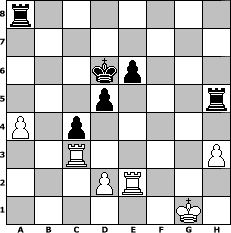 game notation in PGN-format [Event "Herbstturnier 2004"] [Site "www.myChess.de"] [Date "2004.09.02"] [Round "1"] [White "Narkon"] [Black "rikilatic"] [ECO "D00"] [WhitemyELO "1408"] [BlackmyELO "1297"] [Result "0-1"] [TimeControl "10/2592000"] [WhiteDays "096"] [BlackDays "116"] [MyChessNo "6519"] 1. d4 d5 2. e3 Bf5 3. Bd3 e6 4. Nf3 Bxd3 5. Qxd3 Qf6 6. O-O Bd6 7. Nc3 c6 8. e4 Bb4 9. e5 Qe7 10. Bg5 f6 11. Bh4 g5 12. Bg3 Bxc3 13. Qxc3 h5 14. exf6 Nxf6 15. Bxb8 Rxb8 16. Qc5 Qxc5 17. dxc5 g4 18. Ne5 Ne4 19. f3 gxf3 20. Rxf3 Nxc5 21. c3 Nd7 22. Nxd7 Kxd7 23. Rf7+ Kd6 24. b4 a6 25. Re1 b6 26. Rf6 Rbe8 27. Re2 h4 28. h3 Rh5 29. Rf3 a5 30. g3 hxg3 31. Rxg3 axb4 32. cxb4 c5 33. bxc5+ bxc5 34. a4 c4 35. Rc3 Ra8 0-1 position notation in FEN-format r7/8/3kp3/3p3r/P1p5/2R4P/3PR3/6K1 - - - 2 36 Captured white pieces: ![]() ![]() ![]() ![]() ![]() ![]() ![]() ![]() ![]() ![]() ![]() ![]() ![]() ![]() ![]() Captured black pieces: ![]() ![]() ![]() ![]() ![]() ![]() ![]() ![]() ![]() ![]() ![]() ![]() ![]() ![]() ![]() Click on a captured piece in order to display the desired move!