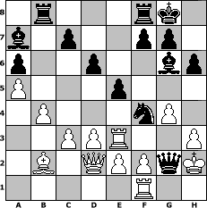 game notation in PGN-format [Event "f"] [Site "www.myChess.de"] [Date "2005.12.25"] [Round "1"] [White "crca108"] [Black "Master1"] [ECO "C65"] [WhitemyELO "1426"] [BlackmyELO "1439"] [Result "0-1"] [TimeControl "10/864000"] [WhiteDays "10"] [BlackDays "10"] [MyChessNo "21152"] 1. e4 e5 2. Nf3 Nc6 3. Bb5 Nf6 4. d3 h6 5. Nc3 Bc5 6. a3 Ng4 7. O-O d6 8. b4 Bb6 9. Nd5 a6 10. Bxc6+ bxc6 11. Bb2 cxd5 12. exd5 O-O 13. a4 Bf5 14. a5 Ba7 15. h3 Nf6 16. g4 Bg6 17. Kh2 Nxd5 18. Rb1 Qf6 19. c3 Rab8 20. Qd2 Qxf3 21. Rbe1 Nf4 22. Re3 Qg2# 0-1 position notation in FEN-format 1r3rk1/b1p2pp1/p2p2bp/P3p3/1P3nP1/2PPR2P/1B1QPPqK/5R2 - - - 4 23 Captured white pieces: Captured black pieces: Click on a captured piece in order to display the desired move!