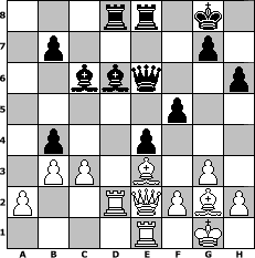 game notation in PGN-format [Event "Sweschnikow III"] [Site "www.myChess.de"] [Date "2012.09.05"] [Round "1"] [White "Naunhofer"] [Black "UPS"] [ECO "B33"] [WhitemyELO "1627"] [BlackmyELO "1694"] [Result "1/2-1/2"] [TimeControl "10/1728000"] [WhiteDays "19"] [BlackDays "20"] [MyChessNo "83755"] 1. e4 c5 2. Nf3 Nc6 3. d4 cxd4 4. Nxd4 Nf6 5. Nc3 e5 6. Ndb5 h6 7. Nd5 Nxd5 8. exd5 a6 9. dxc6 axb5 10. cxd7+ Bxd7 11. Be2 Be7 12. Bf3 Bc6 13. O-O O-O 14. Qe2 Qc7 15. c3 Bd6 16. g3 Rfe8 17. Be3 Qe7 18. Bg2 Qe6 19. b3 e4 20. Rad1 Rad8 21. Rfe1 f5 22. Rd2 b4 1/2-1/2 position notation in FEN-format 3rr1k1/1p4p1/2bbq2p/5p2/1p2p3/1PP1B1P1/P2RQPBP/4R1K1 - - - 0 23 Captured white pieces: Captured black pieces: Click on a captured piece in order to display the desired move!