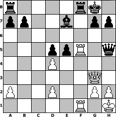 game notation in PGN-format [Event "Der HSF feiert 3.Geburtstag-feiert gern mit!"] [Site "www.myChess.de"] [Date "2013.05.01"] [Round "1"] [White "freizeitspieler"] [Black "Cuibono"] [ECO "D00"] [WhitemyELO "1552"] [BlackmyELO "1796"] [Result "0-1"] [TimeControl "10/2592000"] [WhiteDays "26"] [BlackDays "30"] [MyChessNo "88117"] 1. d4 d5 2. e4 dxe4 3. Nc3 Nf6 4. f3 exf3 5. Nxf3 Bg4 6. Bc4 e6 7. O-O c6 8. Bg5 Nbd7 9. Qe1 Qb6 10. Kh1 Be7 11. Qh4 Qxb2 12. Na4 Qxc2 13. Bb3 Qg6 14. Ne5 Qh5 15. Bxf6 Nxf6 16. Qg3 O-O 17. Rf4 Bf5 18. Raf1 Nd5 19. Bxd5 cxd5 20. Nc3 f6 21. Nxd5 exd5 22. Rxf5 fxe5 0-1 position notation in FEN-format r4rk1/pp2b1pp/8/3ppR1q/3P4/6Q1/P2P2PP/5R1K - - - 0 23 Captured white pieces: ![]() ![]() ![]() ![]() ![]() ![]() ![]() ![]() ![]() ![]() ![]() ![]() ![]() ![]() ![]() Captured black pieces: ![]() ![]() ![]() ![]() ![]() ![]() ![]() ![]() ![]() ![]() ![]() ![]() ![]() ![]() ![]() Click on a captured piece in order to display the desired move!