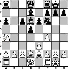 game notation in PGN-format [Event "unter uns Nr. 26"] [Site "www.myChess.de"] [Date "2015.02.14"] [Round "1"] [White "Mattheus"] [Black "Caligula"] [ECO "A03"] [WhitemyELO "1206"] [BlackmyELO "1353"] [Result "0-1"] [TimeControl "10/864000"] [WhiteDays "00"] [BlackDays "20"] [MyChessNo "98106"] 1. f4 d5 2. Nf3 Nf6 3. d4 e6 4. Nc3 Bb4 5. Bd2 O-O 6. e3 c5 7. dxc5 Bxc5 8. Be2 a6 9. O-O Nc6 10. Ne5 Bd7 11. Nxc6 bxc6 12. Na4 Bd6 0-1 position notation in FEN-format r2q1rk1/3b1ppp/p1pbpn2/3p4/N4P2/4P3/PPPBBPPP/R2Q1RK1 - - - 2 13 Captured white pieces: ![]() ![]() ![]() ![]() ![]() ![]() ![]() ![]() ![]() ![]() ![]() ![]() ![]() ![]() ![]() Captured black pieces: ![]() ![]() ![]() ![]() ![]() ![]() ![]() ![]() ![]() ![]() ![]() ![]() ![]() ![]() ![]() Click on a captured piece in order to display the desired move!