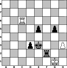 game notation in PGN-format [Event "Arpad Elo Geburtstagstunier"] [Site "www.myChess.de"] [Date "2011.08.23"] [Round "1"] [White "nogumo"] [Black "Lemmi11"] [ECO "A00"] [WhitemyELO "1684"] [BlackmyELO "1771"] [Result "0-1"] [TimeControl "10/1728000"] [WhiteDays "19"] [BlackDays "20"] [MyChessNo "75691"] 1. b4 Nf6 2. Bb2 d5 3. e3 Bg4 4. Be2 Bxe2 5. Nxe2 e6 6. b5 a6 7. a4 axb5 8. axb5 Rxa1 9. Bxa1 Bd6 10. f4 O-O 11. O-O Nbd7 12. Ng3 c6 13. bxc6 bxc6 14. Bxf6 Nxf6 15. d4 Qa5 16. Qd2 Qxd2 17. Nxd2 Ra8 18. c4 Ra2 19. Rd1 Rc2 20. c5 Bc7 21. Ngf1 Kf8 22. Ra1 Ke8 23. Ra7 Kd8 24. h3 h6 25. Nf3 Ne4 26. Ra6 g5 27. Ne5 Bxe5 28. fxe5 Rc1 29. Ra8+ Kd7 30. Ra7+ Ke8 31. Ra8+ Ke7 32. Ra7+ Kf8 33. Ra8+ Kg7 34. Ra2 Ng3 35. Rf2 Re1 36. Rf3 Nxf1 37. Rxf1 Rxe3 38. Rd1 Kg6 39. Kf2 Rc3 40. Ke2 Kf5 41. Rf1+ Ke4 42. Rxf7 Kxd4 43. Rf6 Re3+ 44. Kd2 Rxe5 45. Rxh6 Kxc5 46. Kd3 d4 47. Rg6 Kd5 48. Rg8 Re3+ 49. Kd2 Rg3 50. Rd8+ Ke4 51. Rd6 Rxg2+ 52. Ke1 e5 53. Rxc6 Ke3 54. Kf1 Rf2+ 55. Kg1 d3 0-1 position notation in FEN-format 8/8/2R5/4p1p1/8/3pk2P/5r2/6K1 - - - 0 56 Captured white pieces: Captured black pieces: Click on a captured piece in order to display the desired move!