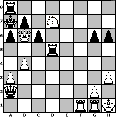game notation in PGN-format [Event "Herbstbeginn"] [Site "www.myChess.de"] [Date "2012.09.16"] [Round "1"] [White "Winston"] [Black "Master1"] [ECO "B10"] [WhitemyELO "1385"] [BlackmyELO "1395"] [Result "1-0"] [TimeControl "10/1728000"] [WhiteDays "20"] [BlackDays "19"] [MyChessNo "83963"] 1. e4 c6 2. e5 d5 3. d4 Bf5 4. h3 e6 5. Nf3 h6 6. a3 f6 7. Bf4 Qc7 8. Qd2 fxe5 9. Bxe5 Qb6 10. b4 Nd7 11. Bf4 Ngf6 12. Bd3 Ne4 13. Bxe4 Bxe4 14. Qe2 a6 15. O-O Nf6 16. Rc1 Nh5 17. Be5 O-O-O 18. c4 Rg8 19. cxd5 exd5 20. Nbd2 Bd6 21. Bxd6 Rxd6 22. Nxe4 dxe4 23. Ne5 Qxd4 24. Qxh5 e3 25. fxe3 Qxe3+ 26. Kh1 Rd5 27. Qg4+ Kb8 28. Nd7+ Ka7 29. Nc5 Rg5 30. Qd7 Rb8 31. Re1 Qf2 32. Rg1 Rd5 33. Qc7 g6 34. Raf1 Qa2 35. Nd7 Ra8 36. Qb6# 1-0 position notation in FEN-format r7/kp1N4/pQp3pp/3r4/1P6/P6P/q5P1/5RRK - - - 5 36 Captured white pieces: Captured black pieces: Click on a captured piece in order to display the desired move!