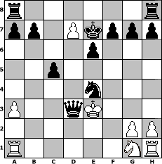game notation in PGN-format [Event "Spass am Schach"] [Site "www.myChess.de"] [Date "2004.03.24"] [Round "1"] [White "Knight"] [Black "Zoltan"] [ECO "C15"] [WhitemyELO "1268"] [BlackmyELO "1649"] [Result "0-1"] [TimeControl "10/864000"] [WhiteDays "30"] [BlackDays "30"] [MyChessNo "3281"] 1. e4 e6 2. d4 d5 3. Nc3 Bb4 4. a3 Bxc3+ 5. bxc3 dxe4 6. f3 c5 7. Bb5+ Bd7 8. Bxd7+ Nxd7 9. d5 Ndf6 10. d6 Nd5 11. Bb2 Ngf6 12. fxe4 Nxe4 13. c4 Qa5+ 14. c3 Ndxc3 15. d7+ Ke7 16. Bxc3 Qxc3+ 17. Ke2 Qxc4+ 18. Qd3 Nc3+ 19. Kd2 Ne4+ 20. Ke3 Qxd3+ 0-1 position notation in FEN-format r6r/pp1Pkppp/4p3/2p5/4n3/P2qK3/6PP/R5NR - - - 0 21 Captured white pieces: Captured black pieces: Click on a captured piece in order to display the desired move!