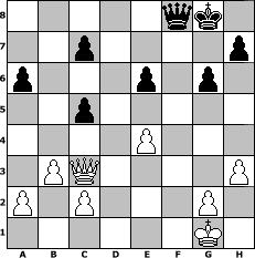 game notation in PGN-format [Event "?"] [Site "www.myChess.de"] [Date "2025.12.01"] [Round "?"] [White "faustballer"] [Black "peter58"] [ECO "A01"] [WhitemyELO "1461"] [BlackmyELO "1542"] [Result "1/2-1/2"] [TimeControl "10/864000"] [WhiteDays "40"] [BlackDays "39"] [MyChessNo "134018"] 1. b3 e5 2. Bb2 Nc6 3. e3 Nf6 4. Bb5 e4 5. Bxc6 bxc6 6. h3 d5 7. Nc3 Bd6 8. Nge2 O-O 9. Na4 c5 10. d3 Re8 11. Bxf6 Qxf6 12. Nac3 Bb7 13. O-O a6 14. dxe4 dxe4 15. Rb1 Be5 16. Qe1 Qg6 17. Rd1 Bc8 18. Kh1 Qh6 19. Ng1 Bxc3 20. Qxc3 Qg5 21. f3 exf3 22. Rxf3 g6 23. Rdf1 Be6 24. e4 Qe7 25. Rf6 Rad8 26. Nf3 Rf8 27. Ng5 Rd6 28. Nxe6 Rxe6 29. Rxe6 fxe6 30. Rxf8+ Qxf8 31. Kg1 1/2-1/2 position notation in FEN-format 5qk1/2p4p/p3p1p1/2p5/4P3/1PQ4P/P1P3P1/6K1 - - - 1 31 Captured white pieces: Captured black pieces: Click on a captured piece in order to display the desired move!