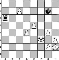 game notation in PGN-format [Event "Juli 2017"] [Site "www.myChess.de"] [Date "2017.07.12"] [Round "1"] [White "faustballer"] [Black "Haneken"] [ECO "C41"] [WhitemyELO "1505"] [BlackmyELO "1068"] [Result "1-0"] [TimeControl "10/2592000"] [WhiteDays "148"] [BlackDays "139"] [MyChessNo "108846"] 1. e4 e5 2. Nf3 d6 3. h3 Nf6 4. d3 Be7 5. b3 h6 6. Bb2 O-O 7. Nc3 c5 8. Be2 Nc6 9. a3 b6 10. O-O Nh5 11. Bc1 a5 12. Nd5 Nf4 13. Nxe7+ Qxe7 14. Bxf4 exf4 15. c3 Be6 16. c4 Qf6 17. Kh2 g5 18. Ng1 Qe5 19. Kh1 Nd4 20. Nf3 h5 21. Nxe5 dxe5 22. Bxh5 Kg7 23. Bg4 Rh8 24. Bxe6 fxe6 25. Qg4 Kf6 26. Rab1 a4 27. bxa4 Rxa4 28. Rxb6 Rxa3 29. Rd1 Rh4 30. Rxe6+ Nxe6 31. Qf5+ Ke7 32. Qxe5 Ra6 33. Rb1 Ra7 34. Rb6 Rh6 35. Rxe6+ Rxe6 36. Qxc5+ Kf6 37. Qxa7 Rd6 38. d4 Kg6 39. e5 Re6 40. Qd7 Ra6 41. c5 Ra1+ 42. Kh2 Ra6 43. c6 Ra2 44. f3 g4 45. fxg4 f3 46. Qf5+ Kg7 47. Qxf3 Ra6 48. c7 1-0 position notation in FEN-format 8/2P3k1/r7/4P3/3P2P1/5Q1P/6PK/8 - - - 0 48 Captured white pieces: Captured black pieces: Click on a captured piece in order to display the desired move!