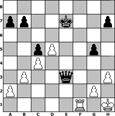game notation in PGN-format [Event "4. Windeck Open"] [Site "www.myChess.de"] [Date "2011.06.29"] [Round "1"] [White "Joschi"] [Black "BobbyF4"] [ECO "C40"] [WhitemyELO "1544"] [BlackmyELO "1465"] [Result "0-1"] [TimeControl "10/864000"] [WhiteDays "30"] [BlackDays "13"] [MyChessNo "74802"] 1. e4 e5 2. Nf3 f5 3. Nxe5 Qf6 4. d4 d6 5. Nc4 fxe4 6. Nc3 Qg6 7. Qe2 Nf6 8. Nd2 d5 9. f3 Nc6 10. fxe4 Nxd4 11. Qd3 c5 12. Nxd5 Nxd5 13. exd5 Bf5 14. Qe3+ Kf7 15. Bd3 Re8 16. Qxe8+ Kxe8 17. O-O Bd6 18. Bxf5 Nxf5 19. Nc4 Kd7 20. Nxd6 Nxd6 21. c4 Qd3 22. Bf4 Rf8 23. Bxd6 Rxf1+ 24. Rxf1 Kxd6 25. b3 Qe3+ 26. Kh1 Ke7 27. h3 g5 0-1 position notation in FEN-format 8/pp2k2p/8/2pP2p1/2P5/1P2q2P/P5P1/5R1K - - - 0 28 Captured white pieces: Captured black pieces: Click on a captured piece in order to display the desired move!