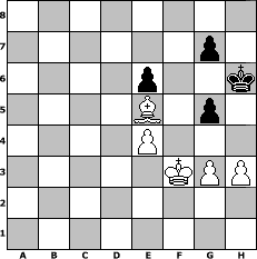 game notation in PGN-format [Event "Schach dem Nikolaus VII"] [Site "www.myChess.de"] [Date "2020.11.23"] [Round "1"] [White "Grubengeist"] [Black "lotchi"] [ECO "A07"] [WhitemyELO "2043"] [BlackmyELO "1236"] [Result "1-0"] [TimeControl "10/2592000"] [WhiteDays "30"] [BlackDays "30"] [MyChessNo "119981"] 1. Nf3 d5 2. g3 Bf5 3. d3 Nf6 4. Bg2 Nc6 5. O-O e6 6. Nbd2 h6 7. Re1 Bc5 8. c3 a6 9. b4 Ba7 10. Bb2 O-O 11. a4 Qd6 12. Nb3 Rfe8 13. b5 axb5 14. axb5 Ne5 15. Nxe5 Qxe5 16. Qc1 Bh7 17. c4 Qg5 18. c5 Nd7 19. Qxg5 hxg5 20. Rec1 Bf5 21. e4 dxe4 22. dxe4 Bg6 23. e5 Nxc5 24. Nxc5 Bxc5 25. Rxc5 c6 26. bxc6 bxc6 27. h3 Rab8 28. Bxc6 Rec8 29. Bd4 Rb1+ 30. Rxb1 Bxb1 31. Bd7 Rd8 32. Rc8 Rxc8 33. Bxc8 Kh7 34. f3 Bd3 35. Bb7 Kg6 36. Be4+ Bxe4 37. fxe4 f6 38. Kf2 fxe5 39. Bxe5 Kh6 40. Kf3 1-0 position notation in FEN-format 8/6p1/4p2k/4B1p1/4P3/5KPP/8/8 - - - 2 40 Captured white pieces: Captured black pieces: Click on a captured piece in order to display the desired move!