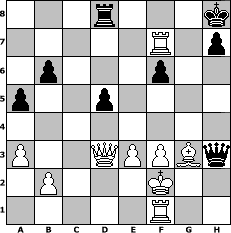 game notation in PGN-format [Event "F"] [Site "www.myChess.de"] [Date "2017.08.16"] [Round "1"] [White "martinus"] [Black "miu"] [ECO "E20"] [WhitemyELO "1754"] [BlackmyELO "1515"] [Result "1-0"] [TimeControl "10/2592000"] [WhiteDays "90"] [BlackDays "78"] [MyChessNo "109211"] 1. d4 Nf6 2. c4 e6 3. Nc3 Bb4 4. Bd2 O-O 5. Nf3 d5 6. cxd5 exd5 7. a3 Bxc3 8. Bxc3 Ne4 9. Bb4 Re8 10. e3 a5 11. Bc3 Nd7 12. Bd3 Ndf6 13. h3 b6 14. O-O Ba6 15. Bxa6 Rxa6 16. Rc1 Ra8 17. Ne5 Qd6 18. Be1 Rad8 19. f3 Ng5 20. Bg3 Rxe5 21. dxe5 Qd7 22. exf6 gxf6 23. Rxc7 Qe6 24. Qd3 Nxh3+ 25. gxh3 Qxh3 26. Kf2 Kh8 27. Rxf7 1-0 position notation in FEN-format 3r3k/5R1p/1p3p2/p2p4/8/P2QPPBq/1P3K2/5R2 - - - 0 27 Captured white pieces: Captured black pieces: Click on a captured piece in order to display the desired move!