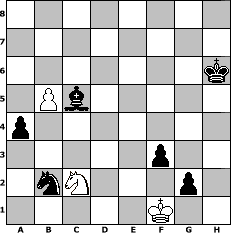 game notation in PGN-format [Event "wie w"] [Site "www.myChess.de"] [Date "2013.11.16"] [Round "1"] [White "borsti"] [Black "Joschi"] [ECO "B12"] [WhitemyELO "1203"] [BlackmyELO "1574"] [Result "0-1"] [TimeControl "10/1728000"] [WhiteDays "20"] [BlackDays "20"] [MyChessNo "91126"] 1. e4 c6 2. d4 d5 3. e5 Bf5 4. Bd3 Bxd3 5. Qxd3 e6 6. Ne2 Nd7 7. Nbc3 a6 8. a3 c5 9. Ng3 cxd4 10. Qxd4 Ne7 11. Bg5 Qc7 12. Bxe7 Bxe7 13. O-O Qxe5 14. Qxe5 Nxe5 15. Rfe1 Nc6 16. Rad1 O-O 17. Re3 d4 18. Red3 dxc3 19. Rxc3 Rfd8 20. Rcd3 Rxd3 21. Rxd3 Rd8 22. Rxd8+ Nxd8 23. c4 Nc6 24. b4 b6 25. f4 Bd6 26. Ne2 g6 27. g4 Kg7 28. g5 e5 29. Kg2 exf4 30. h4 f6 31. b5 axb5 32. cxb5 Ne7 33. a4 fxg5 34. hxg5 h6 35. gxh6+ Kxh6 36. Kf3 g5 37. Kg4 Ng6 38. Nd4 Ne5+ 39. Kh3 Bc5 40. Nc2 g4+ 41. Kg2 Nc4 42. Ne1 Nb2 43. a5 bxa5 44. Nc2 a4 45. Kf1 f3 46. Ke1 g3 47. Kf1 g2+ 0-1 position notation in FEN-format 8/8/7k/1Pb5/p7/5p2/1nN3p1/5K2 - - - 0 48 Captured white pieces: Captured black pieces: Click on a captured piece in order to display the desired move!