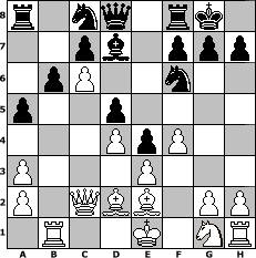 game notation in PGN-format [Event "14. HK-Turnier"] [Site "www.myChess.de"] [Date "2012.10.28"] [Round "1"] [White "Hobbykegler"] [Black "Haki"] [ECO "A45"] [WhitemyELO "1109"] [BlackmyELO "1339"] [Result "1-0"] [TimeControl "10/1728000"] [WhiteDays "19"] [BlackDays "16"] [MyChessNo "84745"] 1. d4 Nf6 2. Bd2 d5 3. c3 Nc6 4. Qc2 e5 5. Na3 Bxa3 6. bxa3 O-O 7. f4 e4 8. e3 Ne7 9. Rb1 b6 10. Be2 Bd7 11. c4 a5 12. c5 Nc8 13. c6 1-0 position notation in FEN-format r1nq1rk1/2pb1ppp/1pP2n2/p2p4/3PpP2/P3P3/P1QBB1PP/1R2K1NR - K - 0 13 Captured white pieces: Captured black pieces: Click on a captured piece in order to display the desired move!