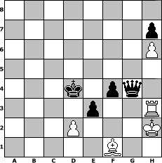 game notation in PGN-format [Event "Dabei ist alles 2"] [Site "www.myChess.de"] [Date "2008.04.04"] [Round "1"] [White "Naunhofer"] [Black "Andreas"] [ECO "D31"] [WhitemyELO "1675"] [BlackmyELO "1545"] [Result "0-1"] [TimeControl "10/864000"] [WhiteDays "10"] [BlackDays "09"] [MyChessNo "44070"] 1. d4 d5 2. c4 e6 3. Nc3 c6 4. e3 g6 5. Nf3 Bg7 6. Bd3 Ne7 7. O-O O-O 8. Rb1 b6 9. b4 dxc4 10. Bxc4 Nd5 11. Qb3 Nxc3 12. Qxc3 Bb7 13. a4 c5 14. Ne5 Bxe5 15. dxe5 Qg5 16. e4 Qe7 17. bxc5 Bxe4 18. cxb6 Bxb1 19. Ba3 Qb7 20. Bxf8 Bf5 21. Bc5 axb6 22. Qb4 Be4 23. Bxb6 Bxg2 24. Rd1 Nc6 25. Qb5 Bh3 26. Bd4 Qd7 27. Qb3 Bg4 28. f3 Nxd4 29. fxg4 Rc8 30. Bf1 Rd8 31. Qd3 Qxa4 32. Kh1 Nc6 33. Qxd8+ Nxd8 34. Rxd8+ Kg7 35. h3 Qe4+ 36. Bg2 Qe1+ 37. Kh2 Qxe5+ 38. Kh1 Qc7 39. Rd1 f5 40. gxf5 gxf5 41. Rb1 Kg6 42. Re1 e5 43. Rg1 Kf6 44. Rf1 f4 45. h4 Kf5 46. Bh3+ Ke4 47. h5 Ke3 48. h6 Qc6+ 49. Kg1 Qg6+ 50. Bg2 Qg5 51. Rf3+ Kd4 52. Kh2 e4 53. Rh3 e3 54. Bf1 Qg4 0-1 position notation in FEN-format 8/7p/7P/8/3k1pq1/4p2R/3P3K/5B2 - - - 2 55 Captured white pieces: Captured black pieces: Click on a captured piece in order to display the desired move!