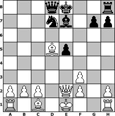 game notation in PGN-format [Event "Pedro Damiano"] [Site "www.myChess.de"] [Date "2016.09.18"] [Round "1"] [White "Joschi"] [Black "Knight"] [ECO "C40"] [WhitemyELO "1531"] [BlackmyELO "1137"] [Result "1-0"] [TimeControl "10/2592000"] [WhiteDays "60"] [BlackDays "60"] [MyChessNo "104981"] 1. e4 e5 2. Nf3 f6 3. d4 d6 4. Bc4 Bg4 5. dxe5 fxe5 6. Qd5 Qe7 7. Qxb7 Bxf3 8. gxf3 Qd8 9. Qxa8 Nf6 10. Bb5+ Kf7 11. Qxa7 Nbd7 12. Bc4+ Ke8 13. Qe3 Be7 14. Nc3 c6 15. Qe2 d5 16. exd5 cxd5 17. Nxd5 Nxd5 18. Bxd5 1-0 position notation in FEN-format 3qk2r/3nb1pp/8/3Bp3/8/5P2/PPP1QP1P/R1B1K2R - KQ - 0 18 Captured white pieces: Captured black pieces: Click on a captured piece in order to display the desired move!
