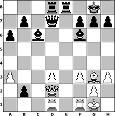 game notation in PGN-format [Event "1. Haithabu-Spiele"] [Site "www.myChess.de"] [Date "2008.08.15"] [Round "1"] [Board "4"] [White "OwainGwynedd"] [Black "brucybabe"] [ECO "B20"] [WhitemyELO "1476"] [BlackmyELO "1671"] [Result "0-1"] [TimeControl "10/2592000"] [WhiteDays "00"] [BlackDays "30"] [MyChessNo "47191"] 1. e4 c5 2. Bc4 Nc6 3. a3 Nf6 4. d3 e6 5. Nc3 Be7 6. h3 O-O 7. Nf3 d6 8. Qe2 a6 9. Be3 d5 10. Bxd5 exd5 11. exd5 Nxd5 12. Bd2 Nd4 13. Nxd4 Nxc3 14. Bxc3 cxd4 15. Bd2 Bf6 16. O-O Bd7 17. Bf4 Bc6 18. Bg3 Qd5 19. f3 Rfe8 20. c4 dxc3 21. Qc2 cxb2 22. Rad1 Qd7 23. Qd2 Rad8 0-1 position notation in FEN-format 3rr1k1/1p1q1ppp/p1b2b2/8/8/P2P1PBP/1p1Q2P1/3R1RK1 - - - 4 24 Captured white pieces: Captured black pieces: Click on a captured piece in order to display the desired move!
