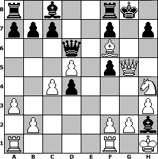 game notation in PGN-format [Event "Pfingst -Turnier"] [Site "www.myChess.de"] [Date "2009.05.30"] [Round "2"] [White "Fussel"] [Black "alpacino"] [ECO "D04"] [WhitemyELO "1258"] [BlackmyELO "1325"] [Result "1-0"] [TimeControl "10/2592000"] [WhiteDays "01"] [BlackDays "80"] [MyChessNo "56184"] 1. d4 d5 2. Nf3 Nf6 3. e3 Nc6 4. h3 e6 5. a3 Ne4 6. Bd3 Bd6 7. O-O Ng5 8. Nxg5 Qxg5 9. Nd2 e5 10. Nf3 Qf6 11. e4 exd4 12. Bg5 Qe6 13. exd5 O-O 14. c4 Qd7 15. Qc2 g6 16. Bf6 Ne7 17. Nh4 Nf5 18. Bxf5 gxf5 19. Qd2 Bh2+ 20. Kh1 Qd6 21. Qg5# 1-0 position notation in FEN-format r1b2rk1/ppp2p1p/3q1B2/3P1pQ1/2Pp3N/P6P/1P3PPb/R4R1K - - - 5 21 Captured white pieces: ![]() ![]() ![]() ![]() ![]() ![]() ![]() ![]() ![]() ![]() ![]() ![]() ![]() ![]() ![]() Captured black pieces: ![]() ![]() ![]() ![]() ![]() ![]() ![]() ![]() ![]() ![]() ![]() ![]() ![]() ![]() ![]() Click on a captured piece in order to display the desired move!