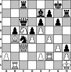 game notation in PGN-format [Event "Chess960 Open II 2014"] [Site "www.myChess.de"] [Date "2014.04.14"] [Round "1"] [White "Erich"] [Black "SibylleSchwerdt"] [Variant "Fischerrandom"] [SetUp "1"] [FEN "qrnbnkbr/pppppppp/8/8/8/8/PPPPPPPP/QRNBNKBR w KQkq - 0 1"] [WhitemyELO "2049"] [BlackmyELO "1678"] [Result "1/2-1/2"] [TimeControl "10/3456000"] [WhiteDays "40"] [BlackDays "31"] [MyChessNo "93937"] 1. e4 h5 2. f3 Bh7 3. d4 h4 4. Be3 h3 5. g3 e6 6. Ncd3 Nf6 7. c3 d5 8. e5 Nd7 9. Bc2 Kg8 10. Nf4 c5 11. Bxh7+ Rxh7 12. Ned3 b6 13. O-O Ne7 14. b4 cxb4 15. cxb4 b5 16. Nc5 Nb6 17. Nfd3 Nc6 18. Bd2 a5 19. Bc3 axb4 20. Nxb4 Be7 21. Nxc6 Qxc6 22. Bb4 Nc4 23. Qc3 Bd8 24. f4 g6 25. Rf2 Rc8 26. Kh1 Be7 1/2-1/2 position notation in FEN-format 2r3k1/4bp1r/2q1p1p1/1pNpP3/1BnP1P2/2Q3Pp/P3PR1P/1R5K - - - 4 27 Captured white pieces: Captured black pieces: Click on a captured piece in order to display the desired move!